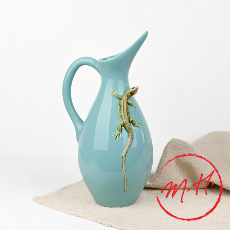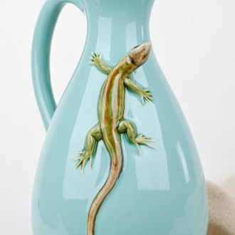 Les courbes ondulées de la carafe à la teinte azuréenne reprennent la position sylphide du petit animal facétieux qui s'y trouve.
