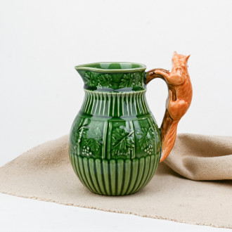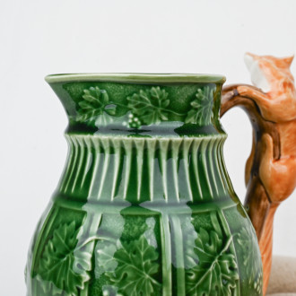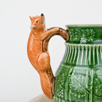 Le corps de la carafe, d’un vert profond orné de motifs végétaux en relief, évoque les forêts luxuriantes. La poignée, représentant un renard au pelage brun roux, apporte une note espiègle et charmante à l’ensemble. Cette alliance de fonctionnalité et d’esthétique en fait une pièce maîtresse pour vos repas ou une décoration singulière pour votre intérieur.