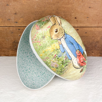Ce gros oeuf de Pâques de 35 cm de haut peut contenir de nombreuses délicieuses sucreries de Pâques. Fabriqué artisanalement, il est décoré de motifs Pierre Lapin, dessinés par la célèbre Beatrix Potter, connue pour ses illustrations enfantines dignes des plus beaux contes de fées.