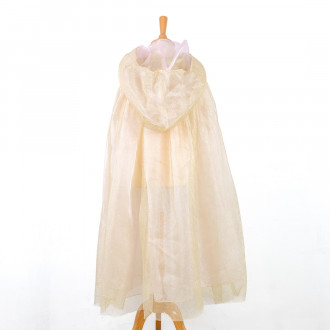 Légère et élégante, cette cape subtilement rosée aux reflets dorés invite à rêver et à imaginer mille aventures. Son tissus doux et brillant se complète d'un grand capuchon ainsi que d'un joli noeud papillon à paillette faisant de l'ensemble un accessoire digne des contes de fées.