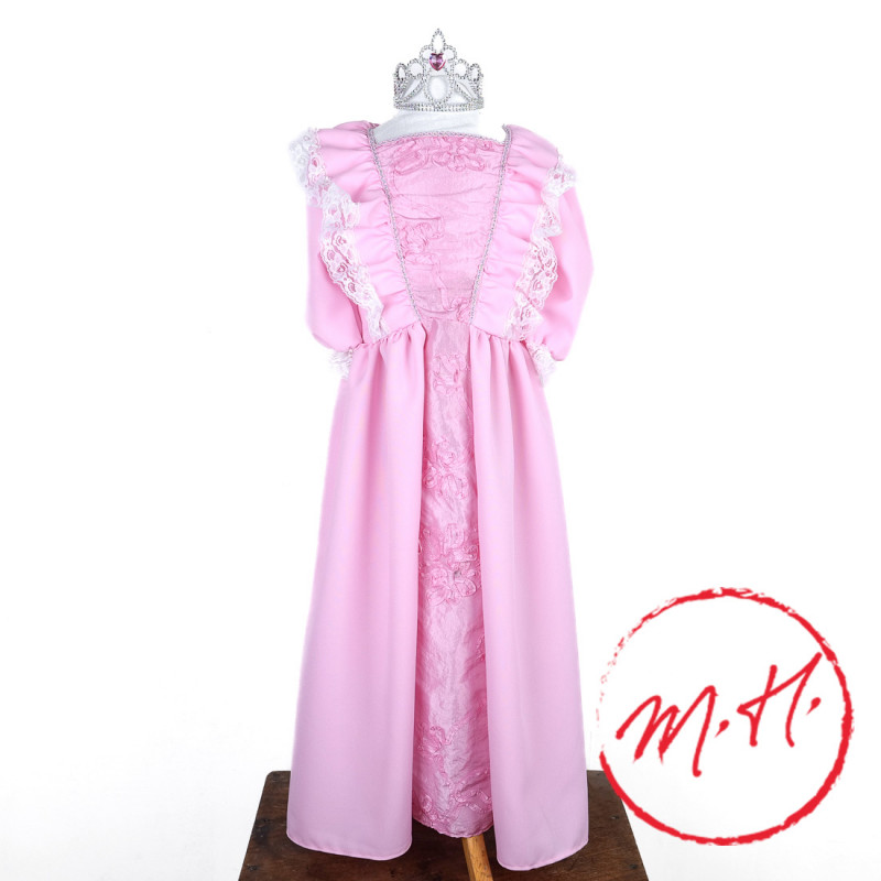 Fabriquée par Le Panache Blanc, maison française reconnue pour son savoir-faire historique dans la confection de costumes pour enfants, cette robe de marquise transporte les plus jeunes au cœur de la Renaissance. D’un rose délicat, elle se distingue par un grand col en dentelle qui apporte élégance et charme, tandis qu’une couronne argentée complète le costume pour parfaire l’allure royale.