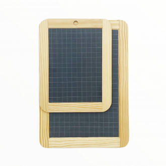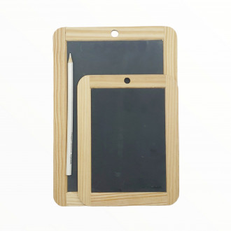 2 tailles disponibles : la standard 18 x 26 cm accompagnée d'un crayon spécial ardoise ou la petite 14,5 x 19 cm livrée seule