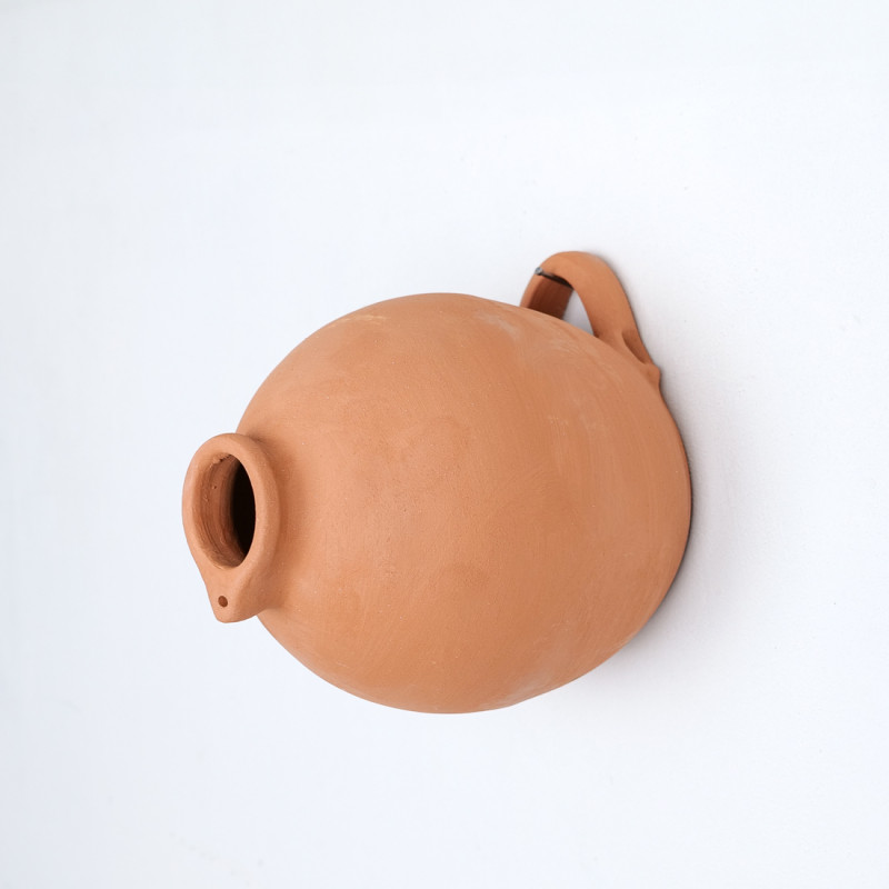 La terre cuite convient naturellement à l'extérieur : elle résiste aux intempéries, respire, et développe avec le temps une patine qui l'intègre au jardin sans effort. Le nichoir se fixe au mur ; un petit trou est prévu pour y glisser une brindille, qui servira de perchoir à l'entrée. Choisir un endroit tranquille hors de portée des chats, la sortie dirigée à l'abri de la pluie.