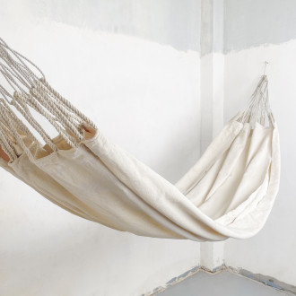 Suspendu dans l’air doux d’un après-midi d’été, cet hamac double en coton écru invite au repos, seul ou à deux.