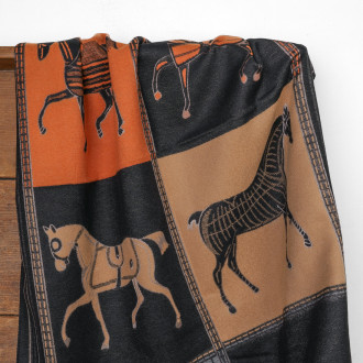 L’écharpe aux couleurs chaleureuses se distingue par de beaux motifs équestres, tandis que le bracelet associe cuir de bovin et laiton travaillé par les artisans de la maison.