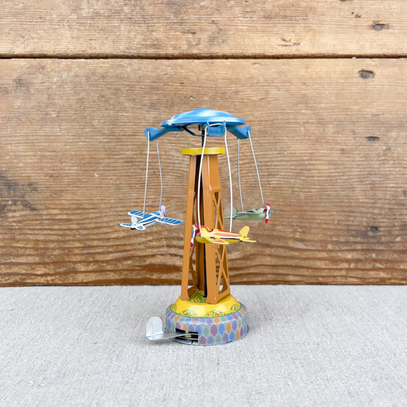 Ce ravissant jouet mécanique, conçu avec soin, prend la forme d’un manège à avions miniature qui séduira les amateurs de nostalgie et les collectionneurs d’objets d’exception.