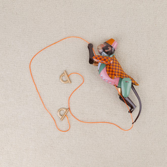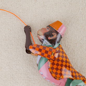 Ce singe acrobate en tôle colorée, fidèle reproduction des jouets d’autrefois, grimpe agilement le long de sa corde dès qu’on la tend.