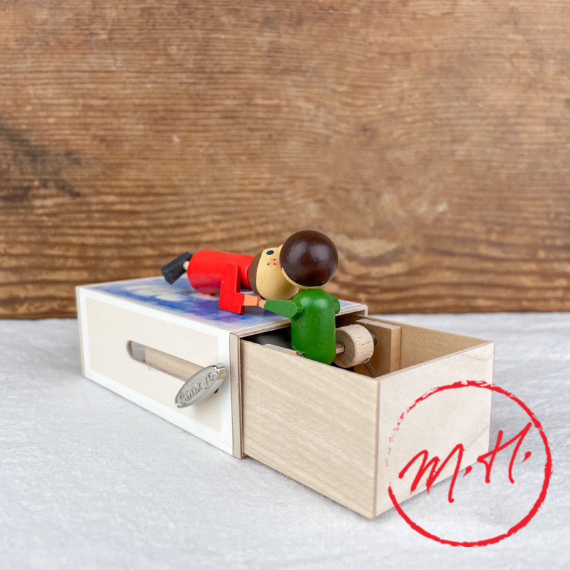 Ce type de boîte à musique coulissante à clef est un objet fabriqué traditionnellement en Allemagne depuis plus de 100 ans dans la région de Seiffen. Celle-ci est issue d'une ébénisterie allemande vieille de trois générations.