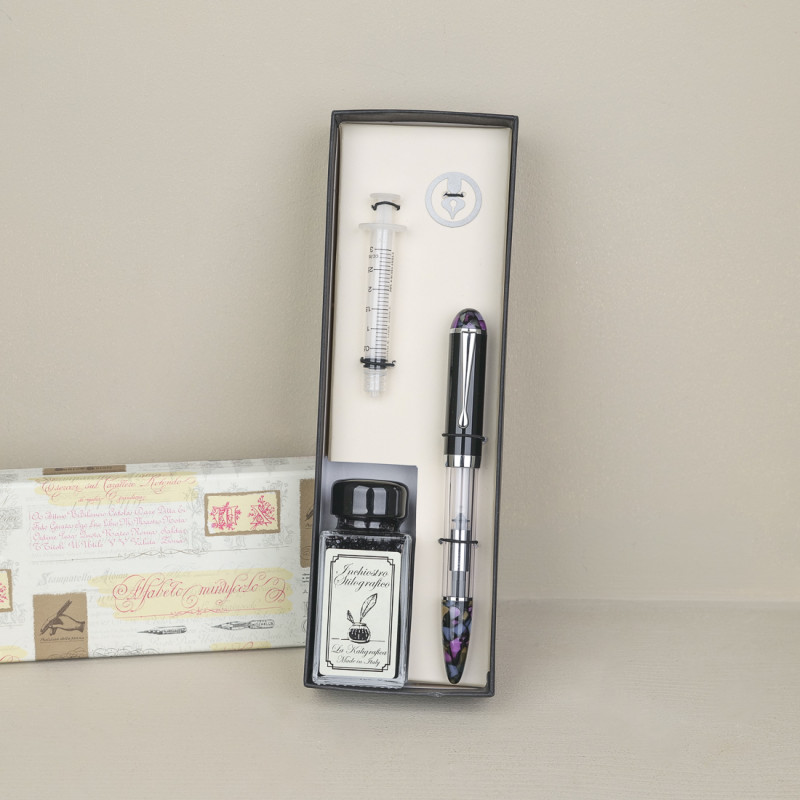 Le coffret contient : un stylo rechargeable, un flacon d’encre et une pompe qui facilite le remplissage, ce qui garanti une utilisation durable du stylo.