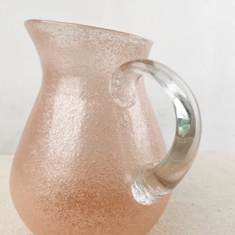 Façonnée à la main selon la technique du verre soufflé, cette carafe en pâte de verre se distingue par sa silhouette généreuse et son aspect naturellement bullé.