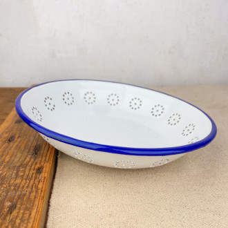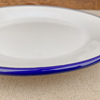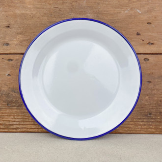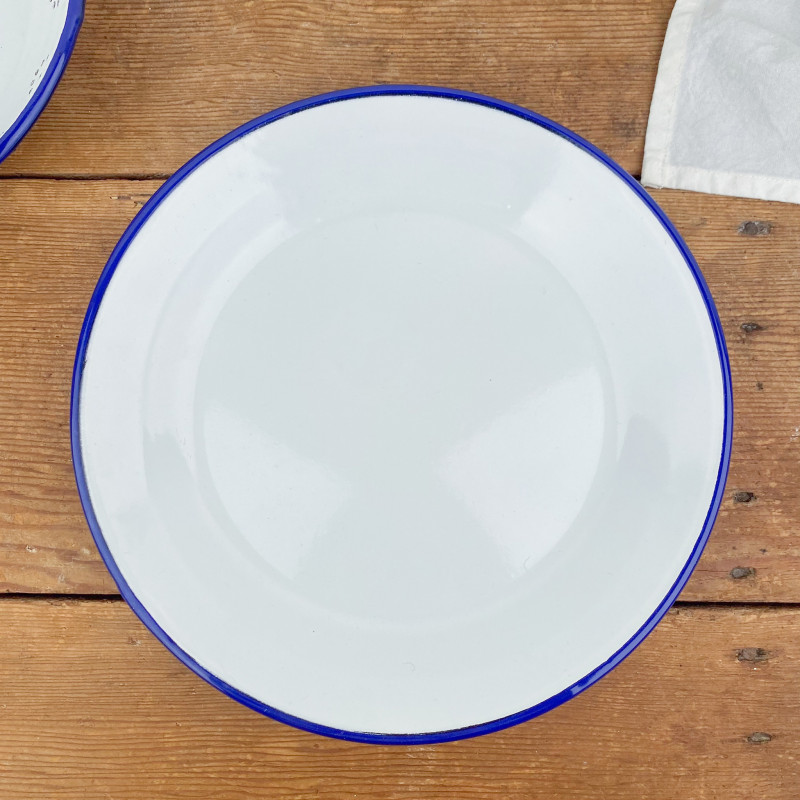 Assiette en tôle émaillée blanche à liseré bleu marine, pour une table à la fois rétro et intemporelle.