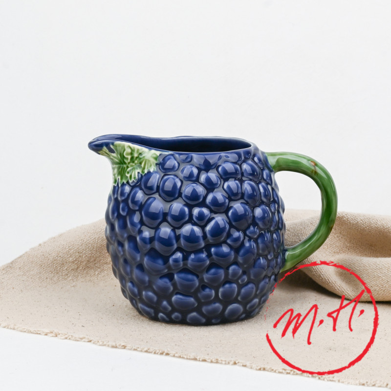Un hommage vibrant à la nature, la Carafe Raisin de Bordallo Pinheiro est une pièce singulière, façonnée à la main dans les ateliers historiques de la maison portugaise. Son design original reprend la forme généreuse et détaillée d’une grappe de raisin, avec des grains sculptés et émaillés à la perfection, tandis que la poignée évoque la tige du fruit, apportant une touche de réalisme remarquable.