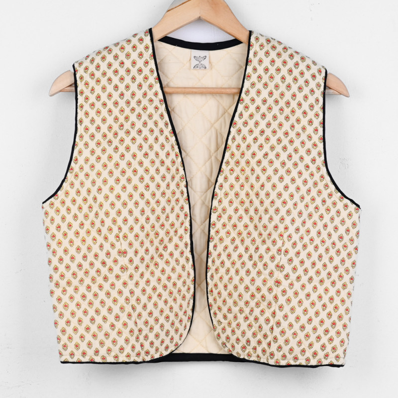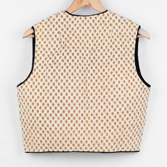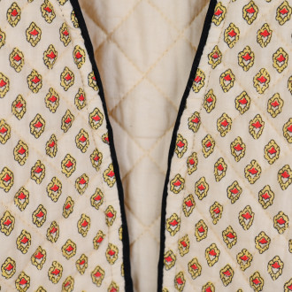 Ce gilet provençal matelassé célèbre l’élégance discrète des textiles traditionnels du Sud, avec son motif calisson imprimé sur un fond beige lumineux.