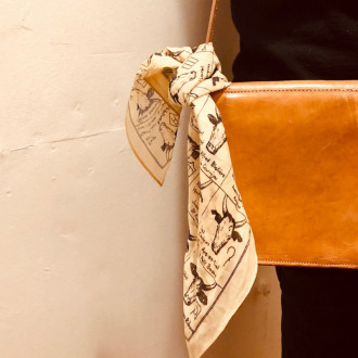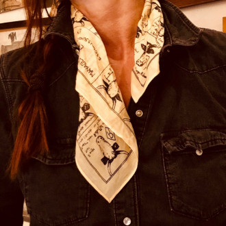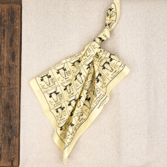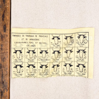 Un foulard en voile de coton écru avec en imprimé les marques des manades de taureaux Camarguaises.