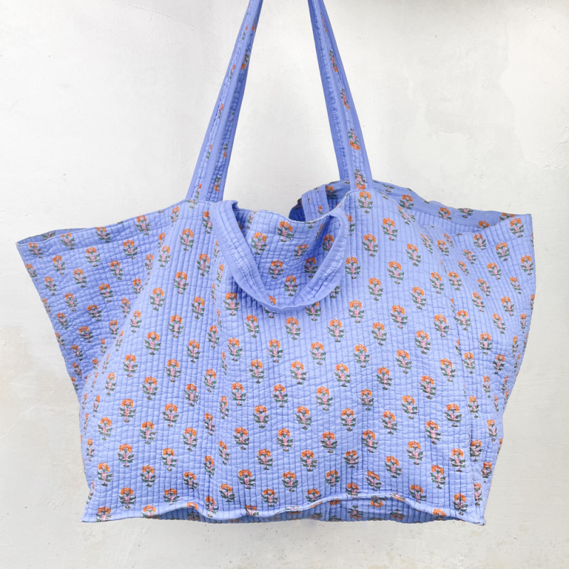 Sac provençal bleu au motifs floraux, fabriqué en 100% coton, matelassé façon boutis.